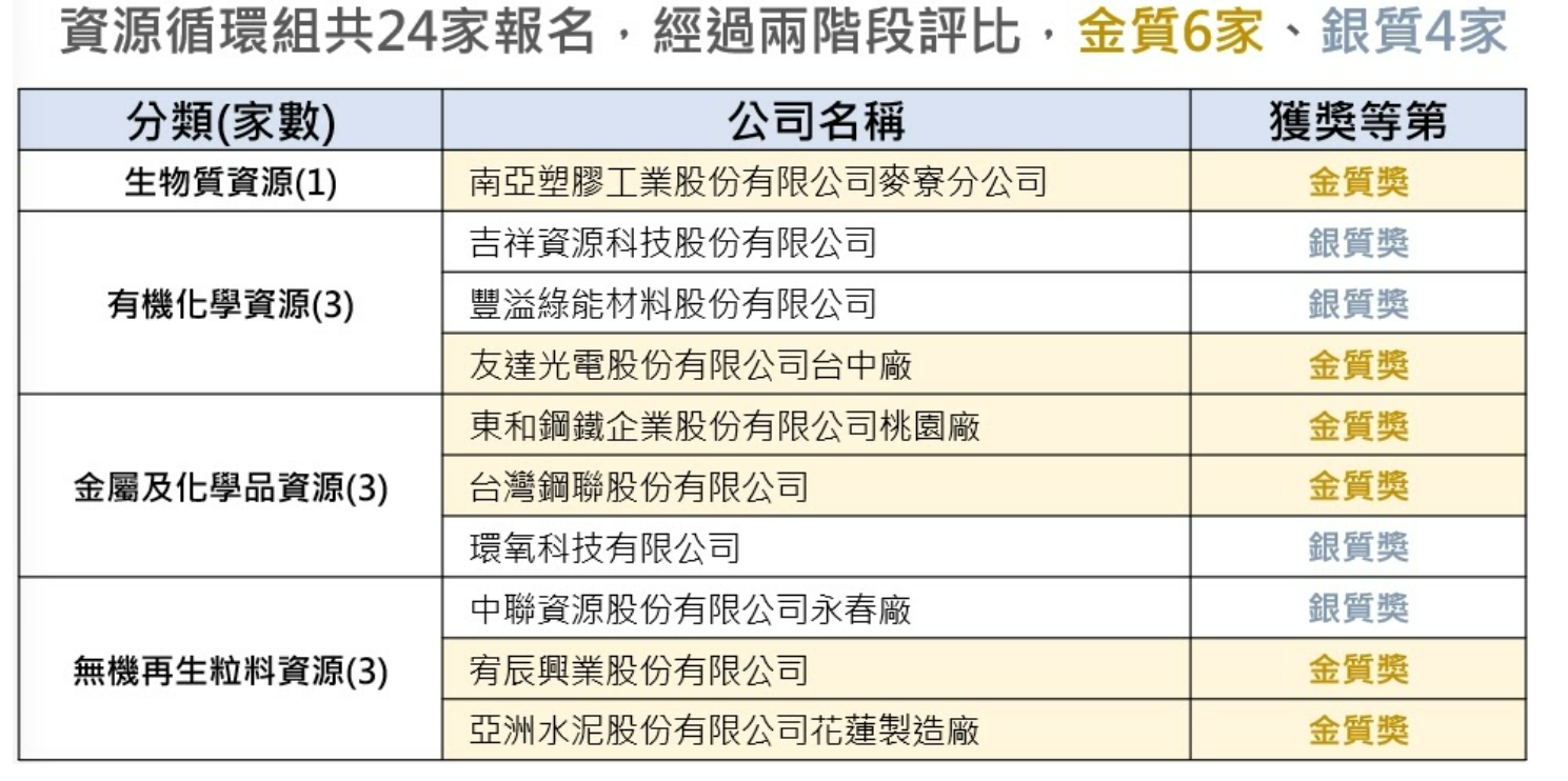 資源循環署每年辦理「資源循環績優企業遴選」,分為源頭管理組、創新應用組及資源循環組等3組,頒獎表揚資源循環績優企業,獎勵績優事蹟並作為典範予以推廣,公私合作共同邁向資源永續循環的世代。